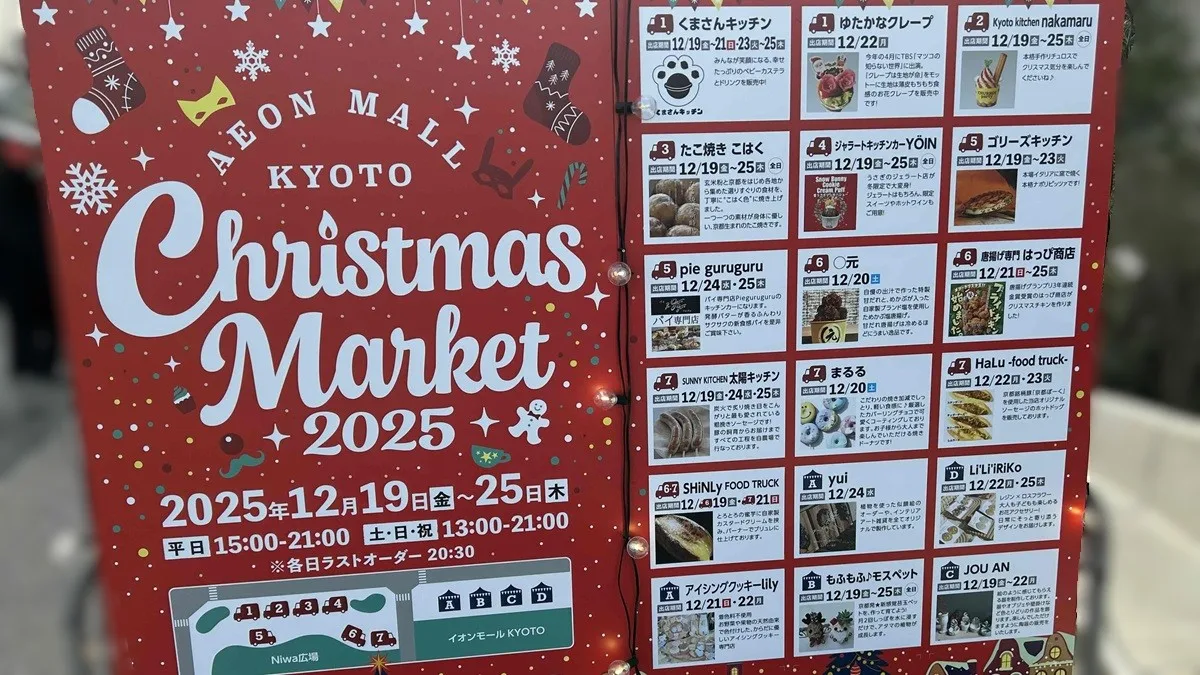 京都市南区、京都駅からもアクセスしやすい大型商業施設「イオンモールKYOTO」で、「Christmas Market 2025」が2025年12月19日~から期間限定で開催中です。