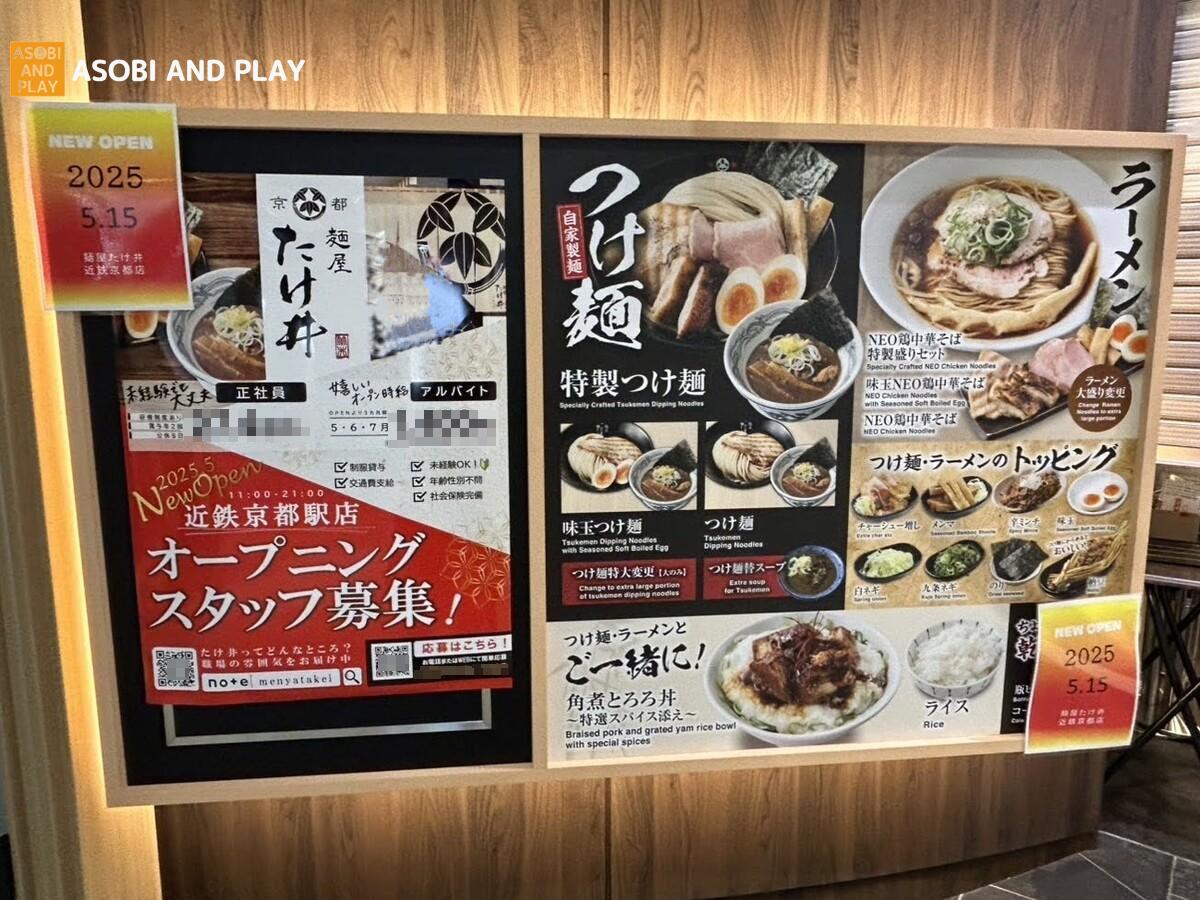 出店場所には、オープンのお知らせがあり「麺屋たけ井 近鉄京都駅店、2025年5月15日 NEW OPEN」ということです。