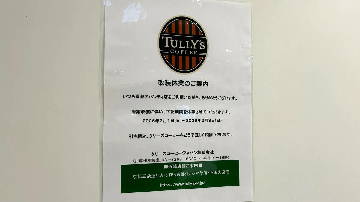 JR京都駅のすぐ南側にあって、待ち合わせやちょっとした休憩に重宝する「タリーズコーヒー 京都アバンティ店」が、現在一時的に休業されています。